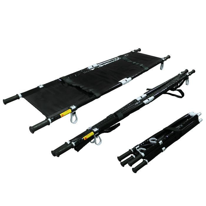 Носилки продольно и поперечно складные, на жестких опорах, брусья изготовлены из легкого сплава, складываются в продольном и поперечном направлении.