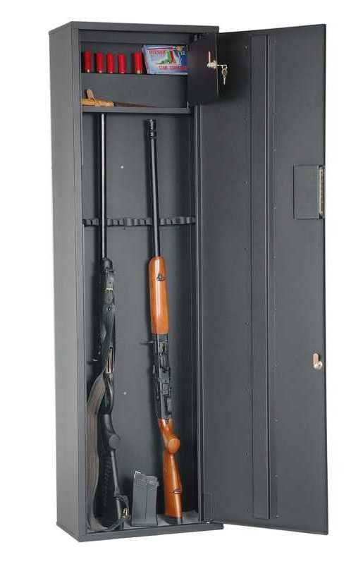 Шкаф односекционный соответствует всем требованиям МВД России. Корпус шкафа толщиной 1 мм, дверь толщиной 1 мм. На задней стенке корпуса расположены отверстия для крепления. Оружейный шкаф на 5 стволов оснащен отделением под патроны. Ложементы — пластик. В дверь установлены 1 замок типа «Cam-Lock» и 1 ключевой сувальдный замок.